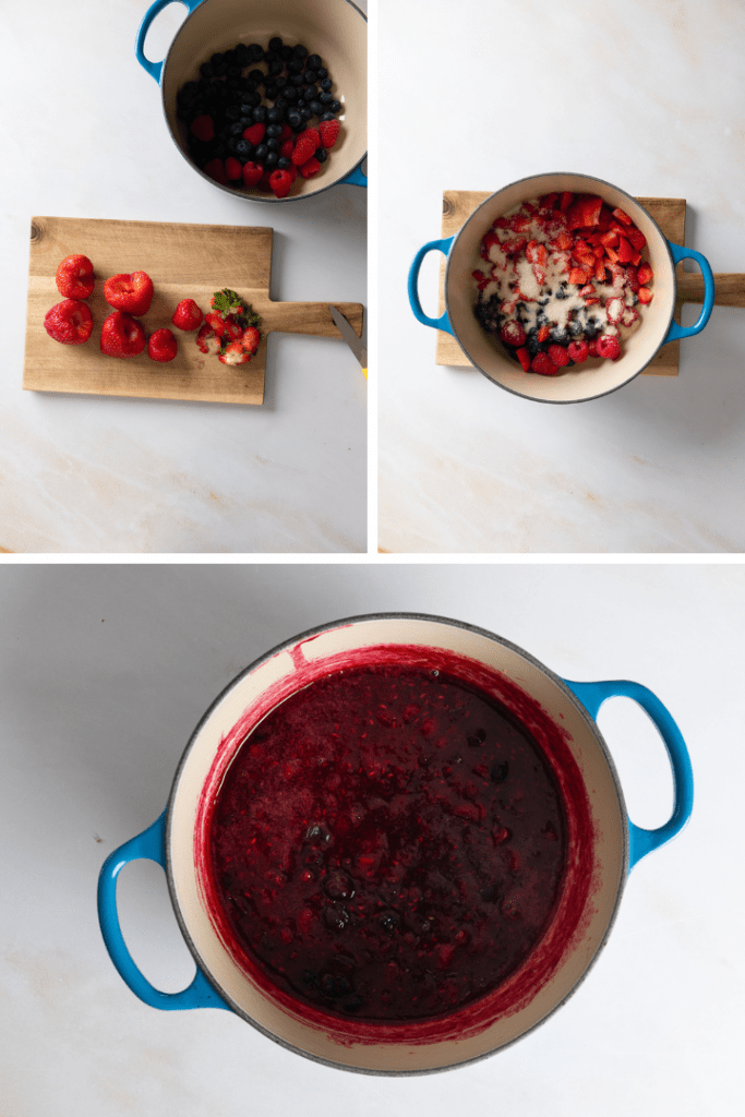 Kuchen nach dem backen komplett auskühlen lassen. Derweil das Beerenkompott zubereiten. Dafür Beeren in einen Topf geben. Größere Beeren wie Erdbeeren vorher in kleine Stücke schneiden. Zucker dazu geben und bei mittlerer Hitze für ca. 30 Minuten köcheln lassen. Wer möchte kann die Beeren nach der Hälfte der Kochzeit mit einem Kochlöffel oder einem Kartoffelstampfer etwas zerdrücken. Das ist kein Muss, sorgt aber später für ein samtigeres Kompott. Nach der Zubereitung in eine Schüssel umfüllen und ebenfalls komplett abkühlen lassen.