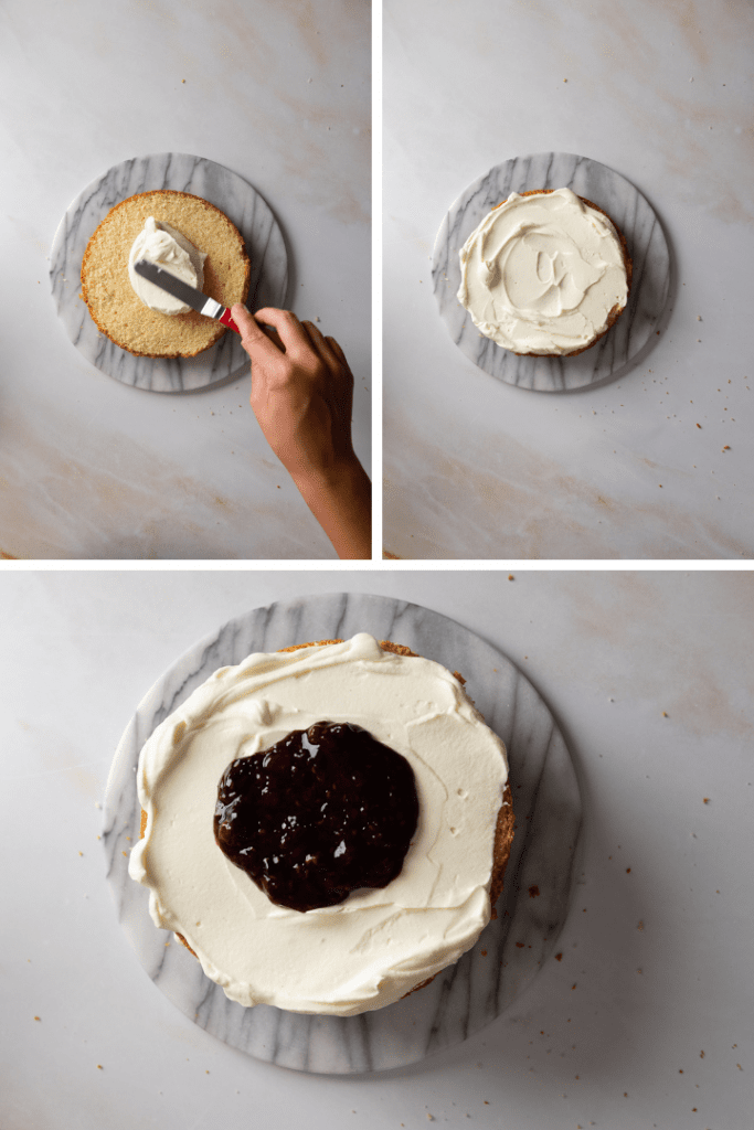 Tortenplatte mit einem kleinen Klecks Creme bestreichen, so hält die Torte besser auf der Platte. Dann den ersten Tortenboden darauf legen. Einen etwa Tennisball großen Klecks Creme auf den Tortenboden geben. Gleichmäßig verteilen, dann in die Mitte etwa 2 EL vom Beerenkompott geben. Den nächsten Tortenboden darauf setzen. So verfahren bis alle Tortenboden verarbeitet sind.