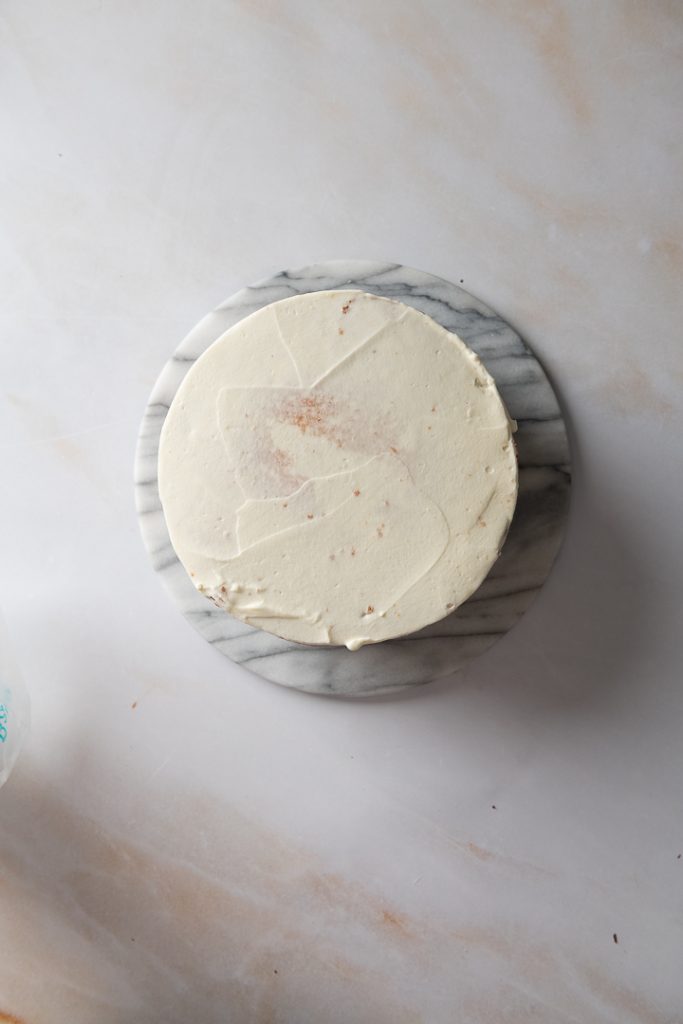 Nun die Torte mit der restlichen Creme einstreichen. Glatt abziehen. Wer möchte lässt die Torte in einer semi-naked Variante, sodass die Böden etwas durchscheinen. Du kannst die Torte aber auch komplett einstreichen. Die Creme-Menge sollte ausreichen. Die Torte nun für ca. 1 Stunde kalt stellen bevor sie dekoriert werden kann.