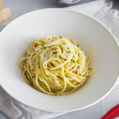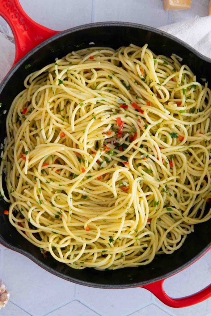 Spaghetti nach der Garzeit abgießen. Dabei eine Tasse des Kochwassers auffangen. Pasta in die Pfanne geben. Petersilie dazugeben und alles gut vermengen. Ist das vorhandene Wasser in der Pfanne zu schnell aufgesogen gerne noch etwas Kochwasser dazu geben. Pasta nun mit Salz abschmecken. Direkt frisch servieren. Mit restlicher Petersilie und Chilistreifen garnieren. Wer mag, reicht Parmesan dazu.