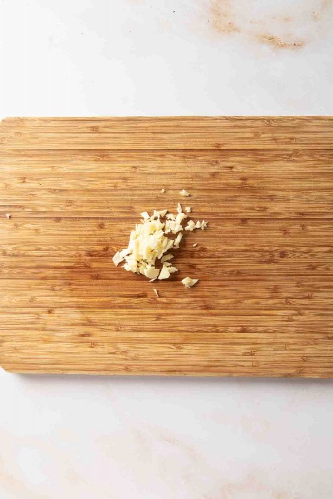 In einem großen Topf reichlich Wasser für die Spaghetti erwärmen. Derweil den Boden einer Pfanne oder eines großen Topfes mit Olivenöl bedecken. Drei Knoblauchzehen schälen und fein Hacken.