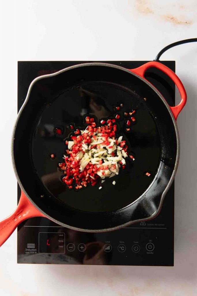 Die gehackten Knoblauchzehen in das Olivenöl geben und bei kleiner Hitze erwärmen, sodass das Öl die Knoblaucharomen annehmen kann. Hacke die Chilischoten und gib sie ebenfalls in die Pfanne. Die Petersilie wird ebenfalls klein geschnitten, aber vorerst zur Seite gestellt.