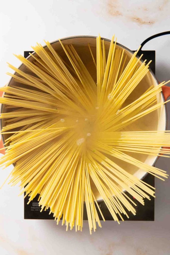 Sobald das Nudelwasser kocht, reichlich Salz (ca. 1 TL pro Liter Wasser) dazu geben. Die Spaghetti eine Minute kürzer als Packungsangabe im kochenden Wasser garen. Eine Tasse des Kochwassers in die Pfanne mit Öl und Knoblauch geben. Das Kochwasser sorgt später dafür, dass die Spaghetti Aglio e Olio schön saftig sind. Eine fein gehackte Chilischote dazu geben.