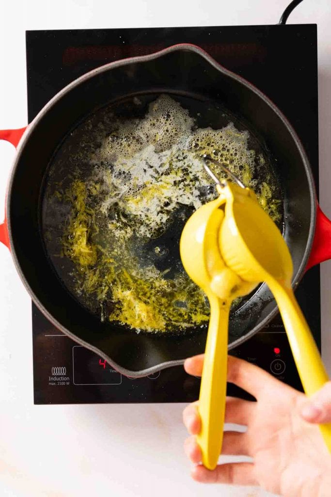 Erwärme derweil das Olivenöl in einer Pfanne und gib den Abrieb der Zitrone dazu. Brate den Abrieb kurz bei kleiner Hitze an, bis das Öl aromatisch nach Zitrone riecht. Gib dann den Saft der Zitrone und die Butter mit in die Pfanne und lass sie bei kleinster Stufe schmelzen.