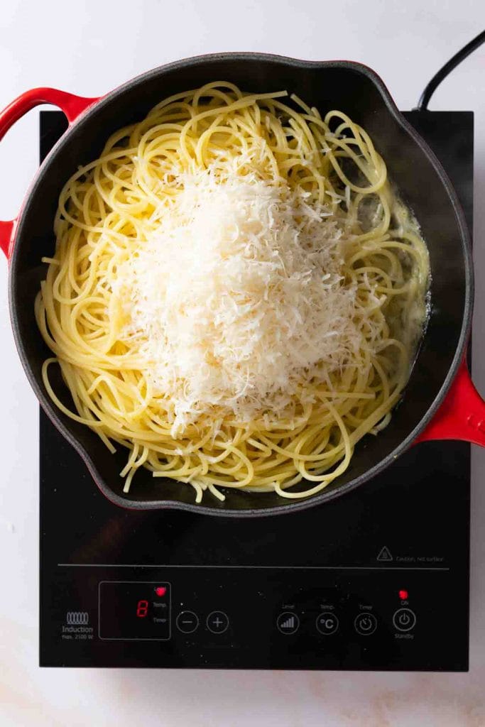 Gieße die Spaghetti ab und fange dabei eine großzügige Tasse des Kochwassers auf. Es ist Entscheidend für die Cremigkeit der Soße. Gib die Spaghetti in die Pfanne und vermenge sie gründlich mit dem Pfanneninhalt. Gib den geriebenen Parmesan sowie schluckweise Pastawasser zugeben und kräftig schwenken/rühren, bis eine cremige Soße entsteht. Schmecke sie mit Salz und Pfeffer ab.