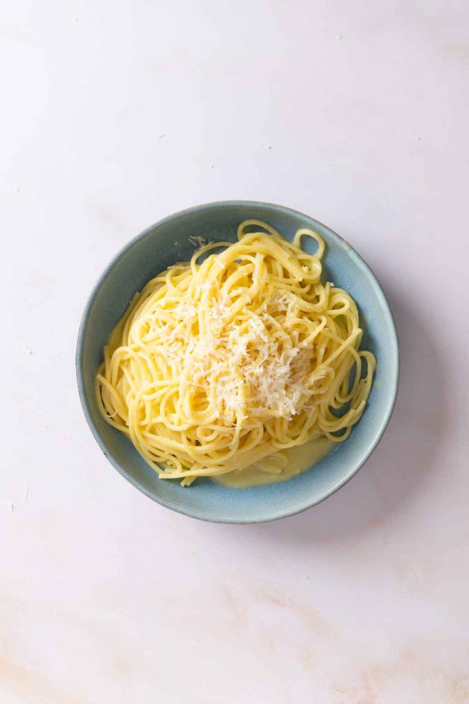 Serviere die Spaghetti al Limone sofort, da die Soße beim Abkühlen andickt und ihre Cremigkeit verliert. Bestreue die Zitronenpasta zum Servieren mit etwas geriebenem Parmesan und Zitronenabrieb.