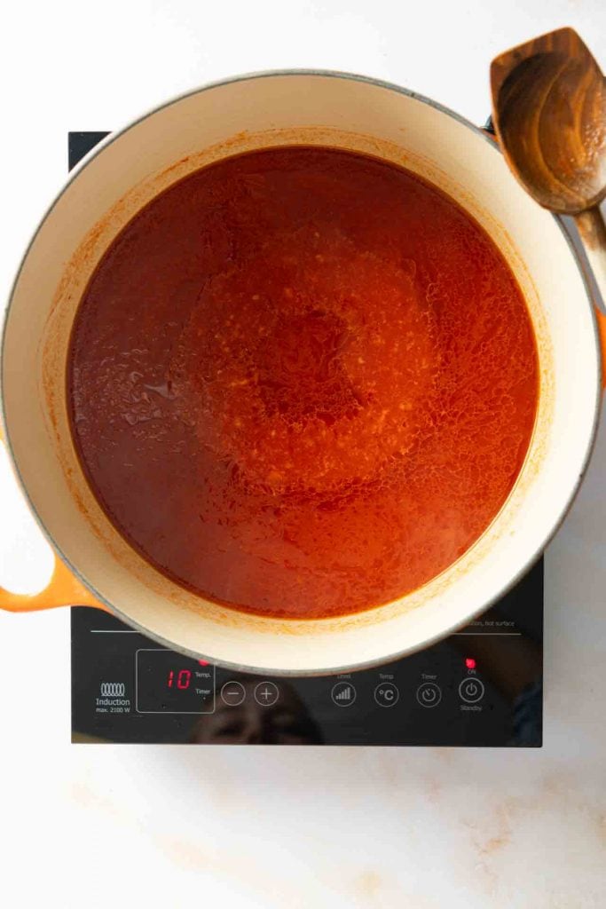 Gieße nun Schöpflöffelweise die Tomatenbrühe auf und rühre gelegentlich. Wiederhole diesen Schritt bis die Nudeln bissfest gekocht sind.