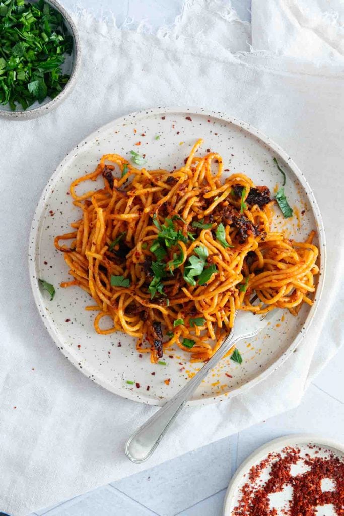 Hacke derweil die Petersilie. Schmecke die Spaghetti ab und und serviere die Spaghetti all’Assassina sobald sie gar sind mit der gehackten Petersilie.