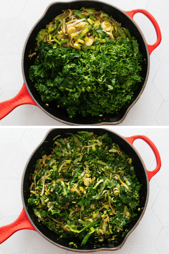 Kräuter hinzufügen: Hacke derweil die Petersilie und den Dill. Gib den gut ausgedrückten Spinat sowie die Kräuter mit in die Pfanne und brate alles kurz mit an, bis die Kräuter welk werden.