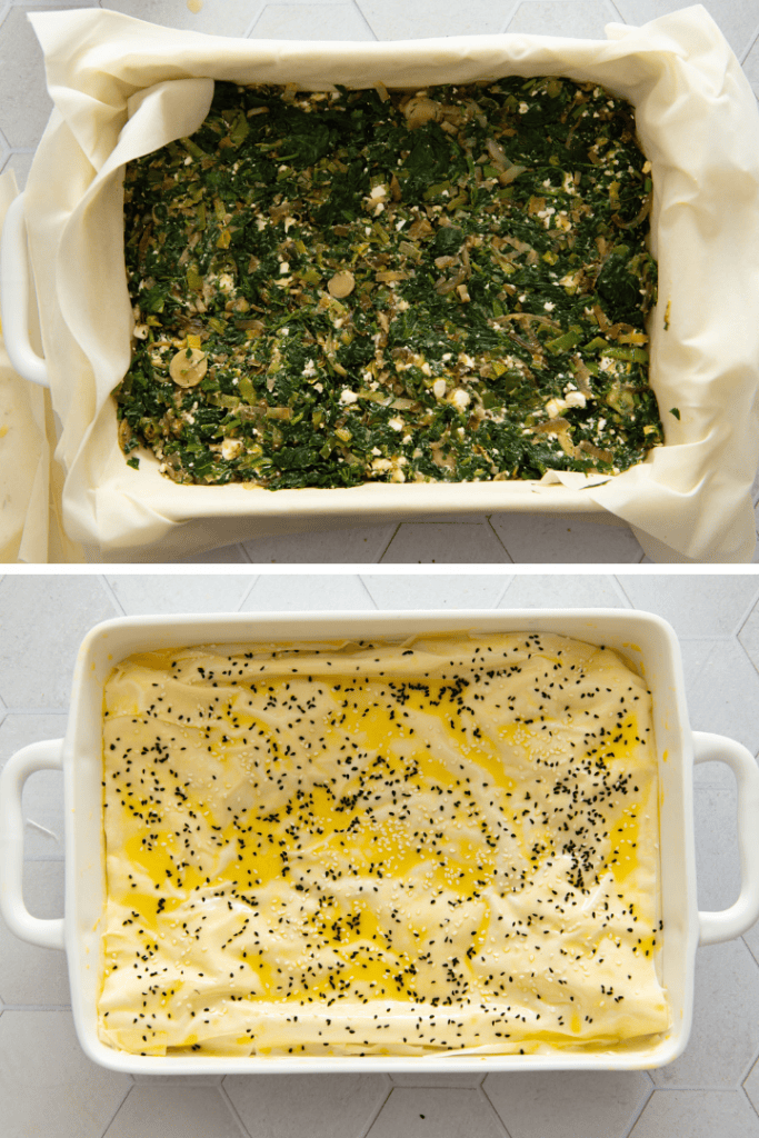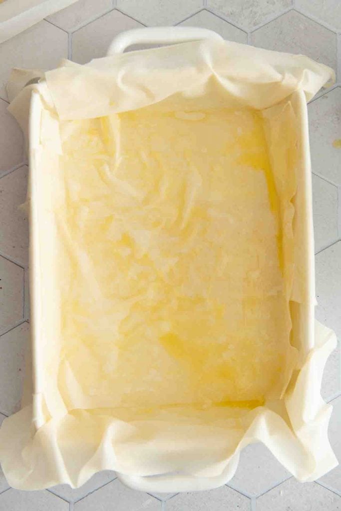 Füllen und verschließen: Gib die Spinatfüllung hinein und verteile sie gleichmäßig. Schlage nun die überlappenden Ränder des Filoteiges über die Füllung. Lege die restlichen Filoblätter als Deckel auf den Auflauf. Zwischen diese einzelnen Schichten pinselst du wieder jeweils etwas von der flüssigen Butter.