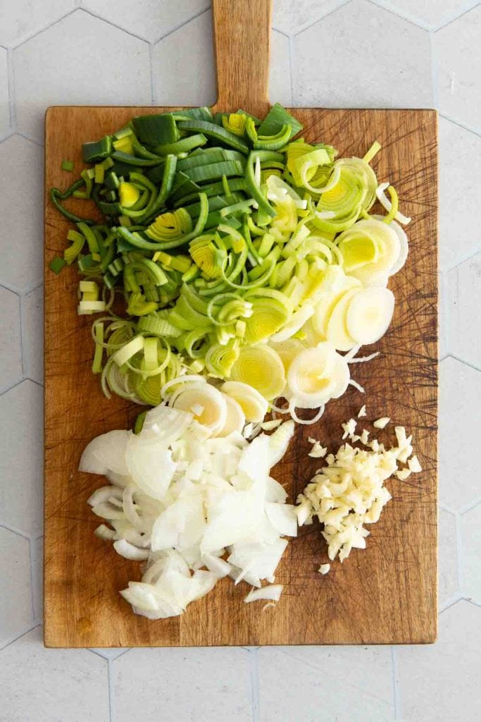 Aromabasis anbraten: Hacke die Zwiebel und die Knoblauchzehen fein. Wasche den Lauch gründlich und schneide ihn in feine Halbringe. Brate Zwiebeln, Lauch und Knoblauch in 15 g Butter an, bis die Zwiebeln glasig werden.