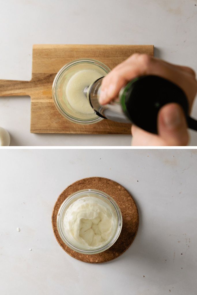 Sonnenblumenöl und Milch in ein hohes Mixgefäß geben. Knoblauchzehe in grobe Stücke schneiden und dazugeben, Salz zufügen. Nun den Stabmixer ausgeschaltet in das Gefäß stellen. Wenn er den Boden berührt auf höchster Stufe einschalten und den Stabmixer nach oben ziehen, 3-4 mal von unten nach oben bewegen, so entsteht eine cremige und feste Alioli. Wichtig: Stabmixer erst im Gefäß einschalten und von Unten nach oben ziehen. Anders herum kommt keine Emulsion zustanden. Die Milch muss gewissermaßen in das Öl gezogen werden, nur so wird die Masse steif. Nach Bedarf mit Salz abschmecken, bis zum Servieren im Kühlschrank lagern.