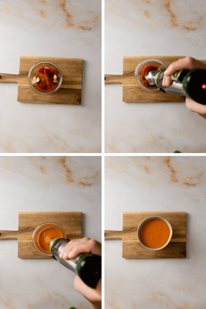 Alle Zutaten für die Mojo in ein hohes Mixgefäß geben. Mit einem Stabmixer zu einer feinen Sauce pürieren, mit Salz und Pfeffer nach Bedarf abschmecken. Bis zum Servieren im Kühlschrank lagern.
