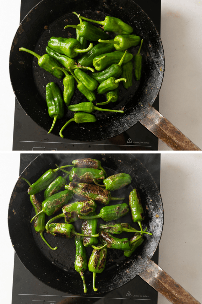 Eine Gusseisen- oder Grillpfanne erwärmen. Pimientos waschen und ohne Öl in die Pfanne geben. Dort bei mittlerer bis hoher Hitze etwa 5 Minuten anbraten, immer wieder wenden. Pimientos aus der Pfanne nehmen wenn sie rundherum gut gebräunt sind. Mit grobem Meersalz bestreuen.