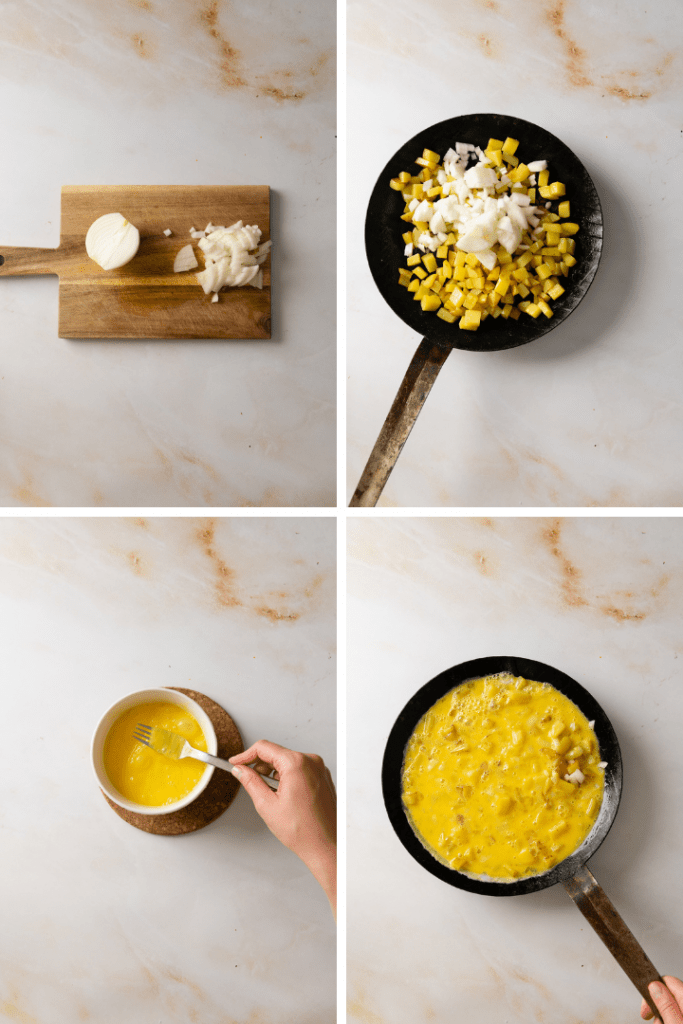 Derweil die Zwiebeln fein hacken. Nach 20 Minuten die Zwiebeln mit in die Pfanne geben, kurz mitdünsten. Dann Salzen und Pfeffern. Eier in eine Schüssel aufschlagen, mit der Gabel verquirlen und in die Pfanne über Kartoffeln und Zwiebeln geben. Deckel wieder schließen und Tortilla für 5 Minuten garen lassen.
