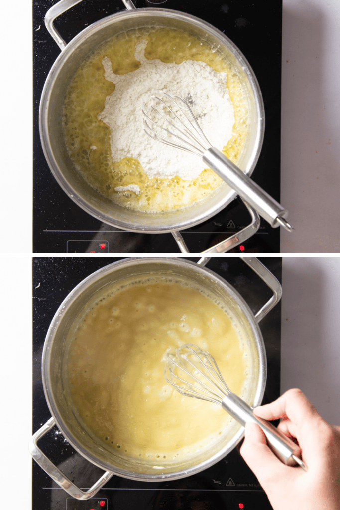 Gib für die Bechamelsoße zunächst die Butter in einen Topf, der mindestens 1,5 Liter fasst. Lass die Butter schmelzen. Rühre dann das Mehl unter, sodass eine cremige Masse entsteht. Lass die Butter-Mehl-Mischung kurz köcheln und rühre dabei ständig, bis die Masse goldgelb wird.