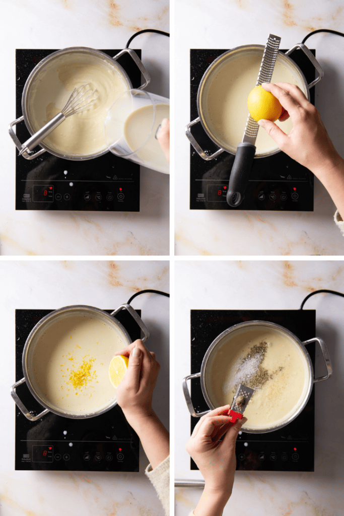 Gib nun nach und nach die Milch dazu. Rühre dabei ständig, sodass sich keine Klümpchen bilden. Füge Zitronenabrieb, Zitronensaft und Muskatnuss hinzu.Köchle die Bechamelsoße einige Minuten bis sie cremig wird und schmecke sie mit Salz und Pfeffer ab.
