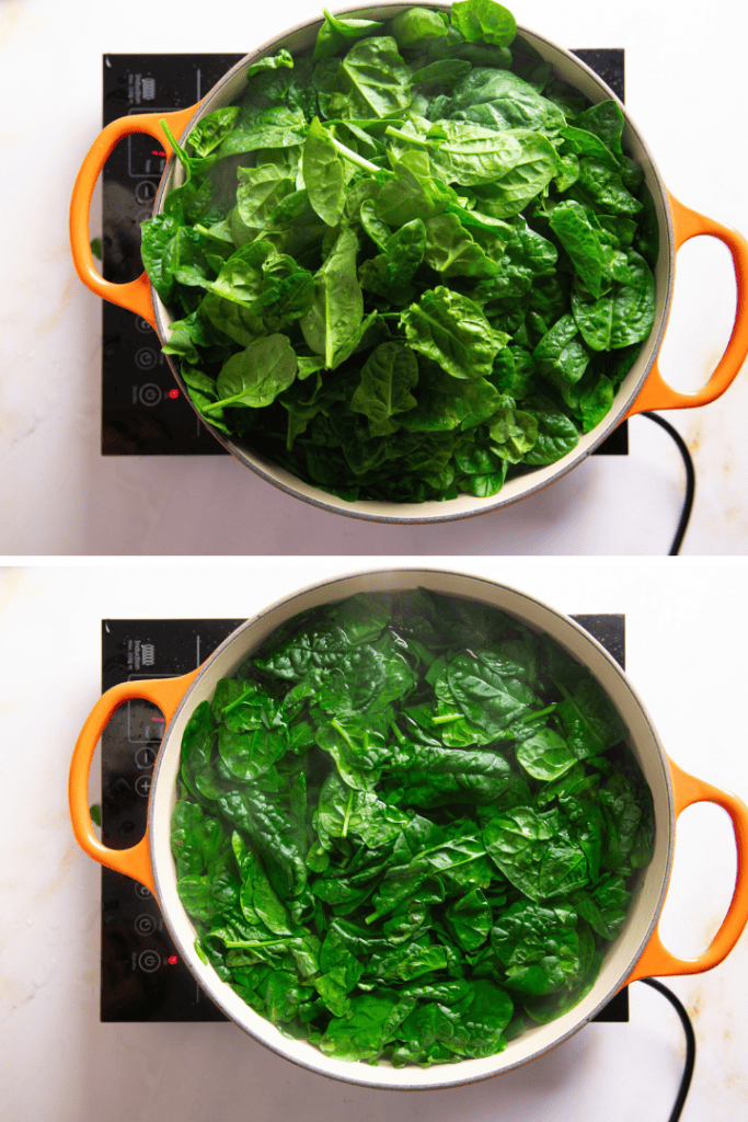Blanchiere den Spinat in kochendem Wasser und schrecke ihn ab. Du kannst diesen Schritt überspringen, wenn du TK Spinat verwendest. Diesen musst du lediglich auftauen lassen und überschüssiges Wasser ausdrücken.