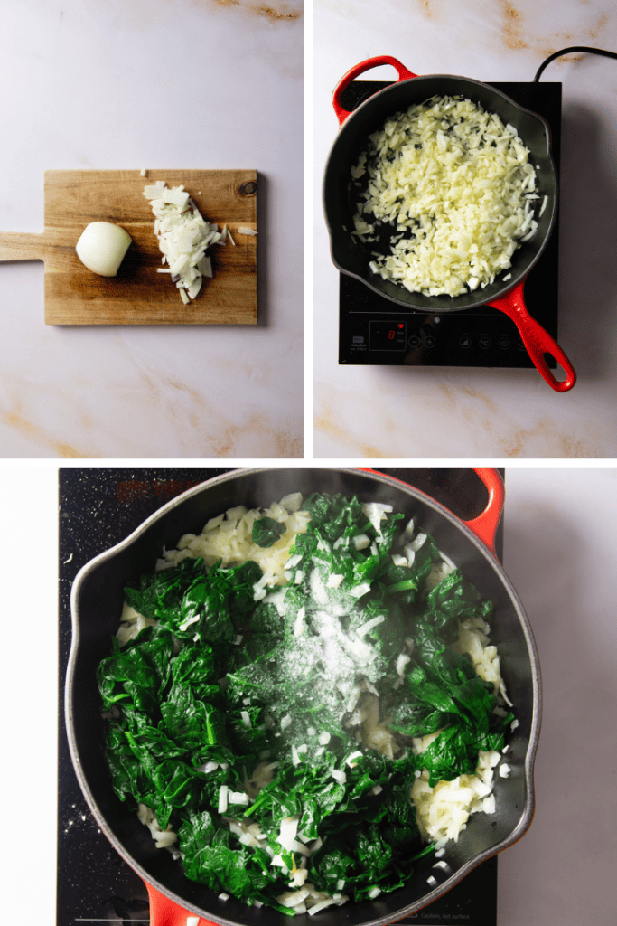 Hacken Zwiebeln und Knoblauch sehr fein. Erwärme Butter und Olivenöl in einer Pfanne und brate Zwiebeln und Knoblauch darin an. Gib den Spinat dazu und brate alles 2-3 Minuten lang an. Schmecke den Spinat mit Salz und Pfeffer ab.