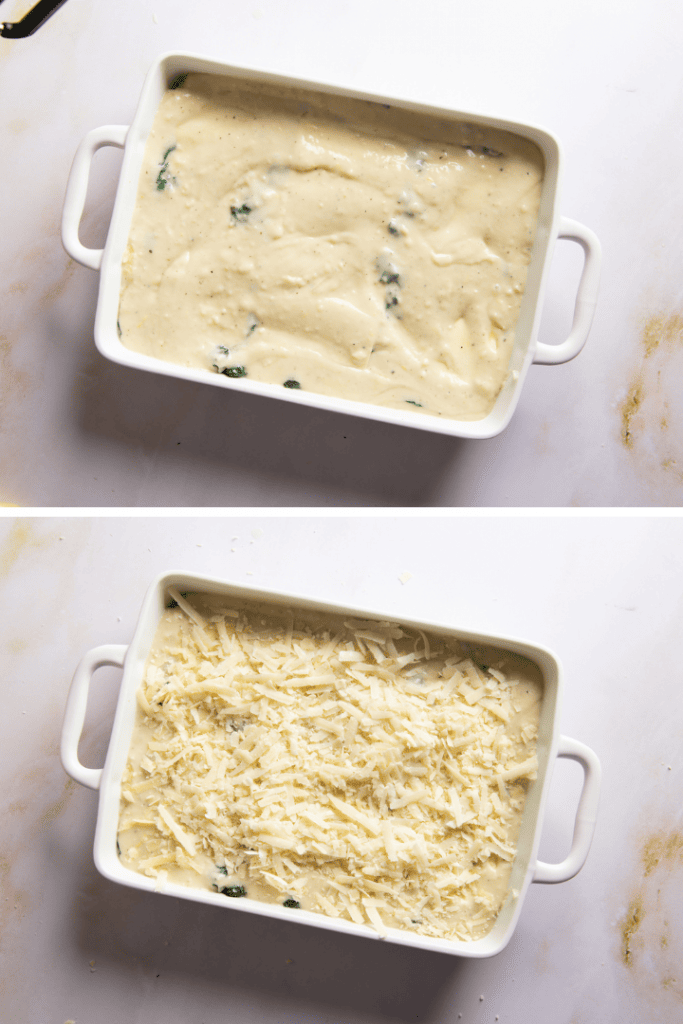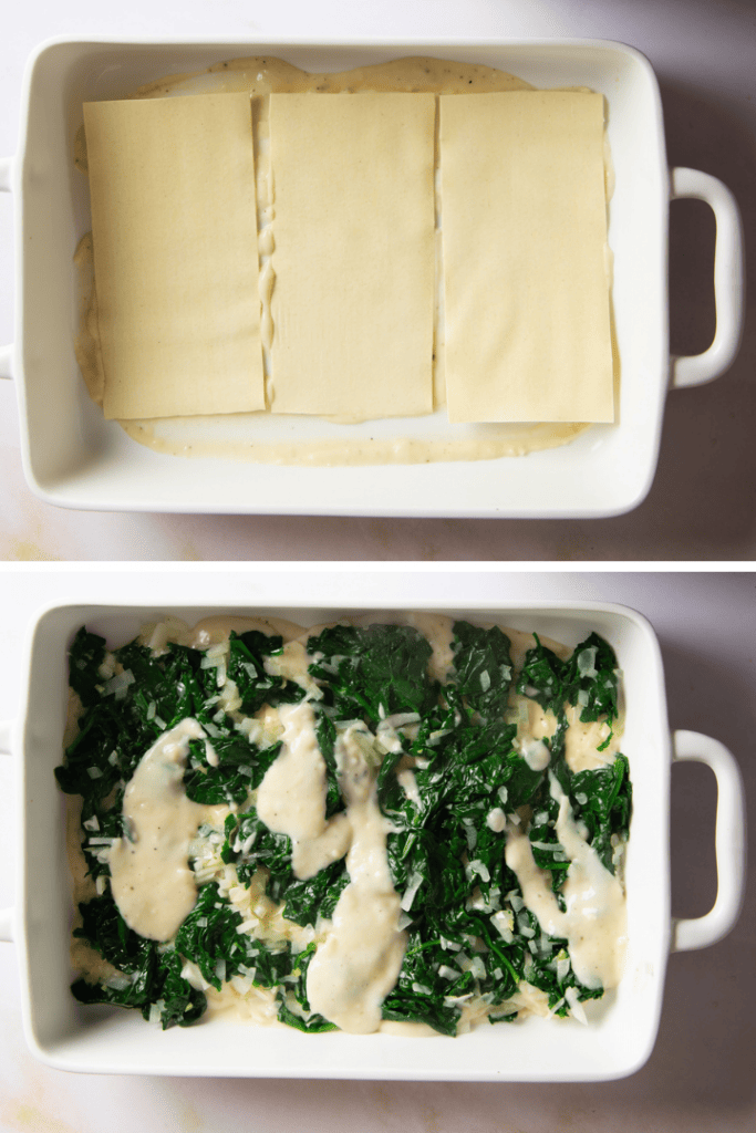 Verteile ein bisschen Bechamelsoße auf dem Boden der Auflaufform. Lege eine Lage Lasagneblätter darauf aus. Bestreiche sie mit Bechamelsoße und verteile etwas Spinat darauf. Lege eine weitere Lage Lasagneblätter darauf und verfahre so weiter, bis der Spinat aufgebraucht ist. Je nach Form bekommst du 2-3 Lagen Spinatfüllung heraus.