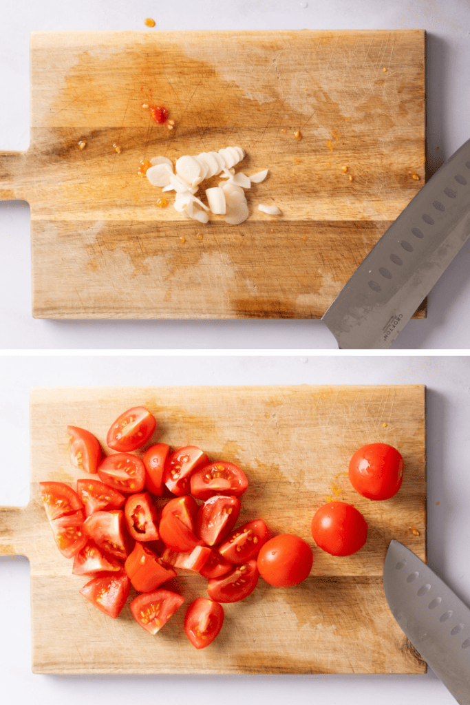 Schneide die Tomaten in Viertel und hacke den Knoblauch fein. Wasche die Kräuter.