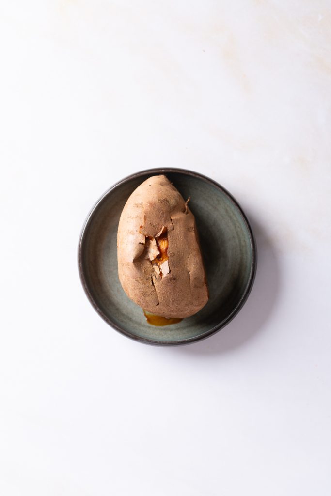 Backe die Süßkartoffel bei 200 °C Ober- und Unterhitze auf dem Gitter für etwa 1 Stunde bis sie weich ist, wenn du sie mit dem Messer piekst.