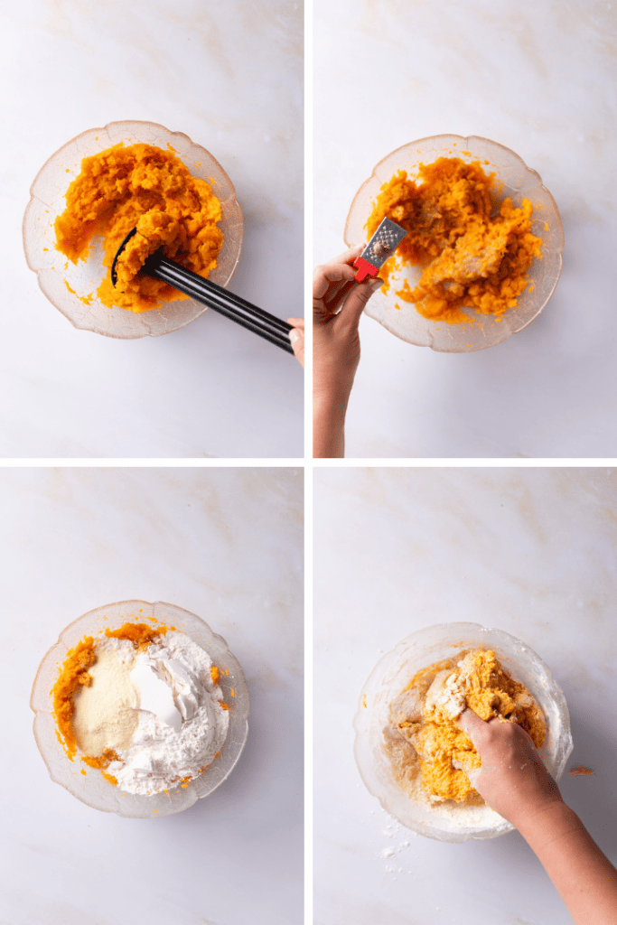 Schäle die Süßkartoffel und gib das Fruchtfleisch in eine Schüssel. Zerdrücke die Süßkartoffel mit einem Kartoffelstampfer oder eine Gabel. Füge Mehl, Grieß, Salz und Muskatnuss dazu und vermenge alle Zutaten.