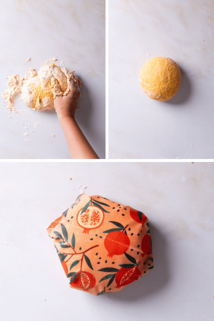 Gib den Teig auf die Arbeitsfläche und knete ihn für etwa 5 Minuten, bis der Teig geschmeidig ist und nicht mehr an den Händen klebt. Gib nach Bedarf mehr Mehl dazu, falls der Teig zu klebrig ist. Decke den Teig mit einem Bienenwachstuch ab und lass ihn für ca. 30 Minuten auf der Arbeitsfläche ruhen.Achtung: Die genaue Mehlmenge ist schwer anzugeben, ja der Wassergehalt jeder Süßkartoffel variieren kann. Gib deshalb nach Bauchgefühl mehr oder weniger Mehl dazu.