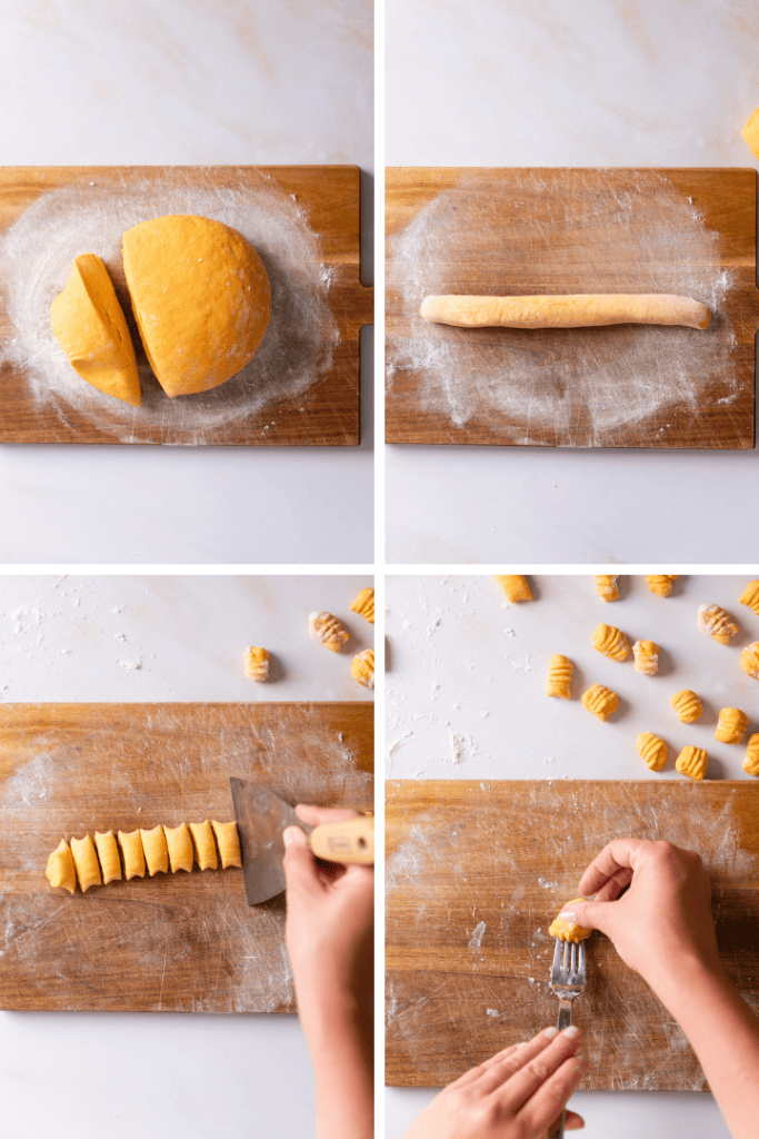 Teile eine etwa Tennisballgroße Teigmenge ab und forme sie zu einem Teigstrang mit etwa 2 cm durchmesser. Unterteile den Teigstrang in etwa 1 cm große Portionen. Rolle nun jede Teigportion mit dem Daumen über die Zinken einer Gabel. So entsteht das typische Muster auf den Gnocchi.