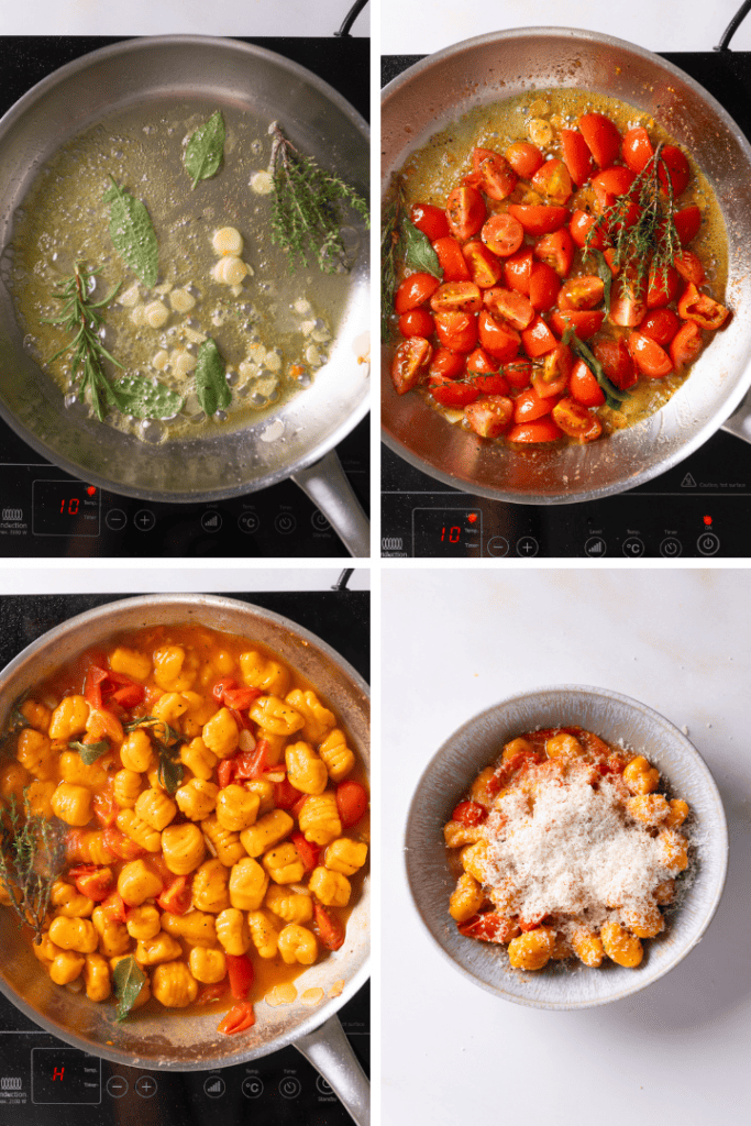 Erhitze Olivenöl und Butter und brate Knoblauch, Kräuter und Tomaten darin für etwa 5 Minuten an. Gib nach Bedarf etwas Wasser dazu. Würze mit Salz und Pfeffer und schwenke die Süßkartoffel Gnocchi in der Soße. Serviere die Süßkartoffel Gnocchi direkt mit frisch geriebenem Parmesan.