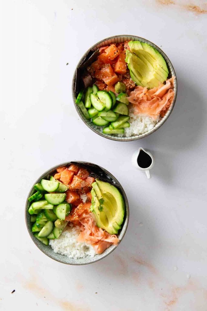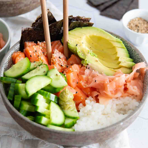 Leckeres Sushi Bowl Rezept mit Lachs, Avocado und Gurke. Fertig im Nu ist die leckere Sushi Reis Bowl das perfekte, gesunde Essen bei akuten Sushi Hunger!