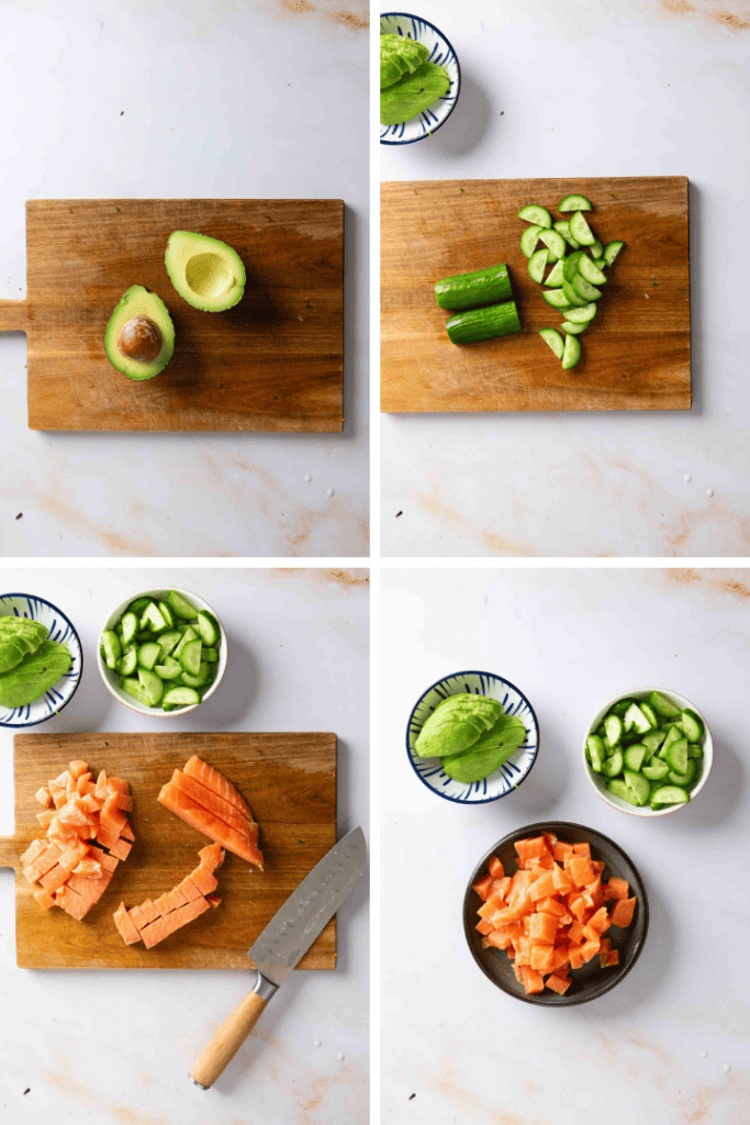 Während der Reis kocht, kannst du die weiteren Zutaten vorbereiten. Entferne die Haut vom Lachsfilet falls nötig und schneide es in mundgerechte Würfel. Schneide die Gurken in schmale Viertelscheiben. Halbiere die Avocado und schneide sie in Streifen. Schneide die Noriblätter in feine Streifen und hacke nach Wunsch die Frühlingszwiebeln.