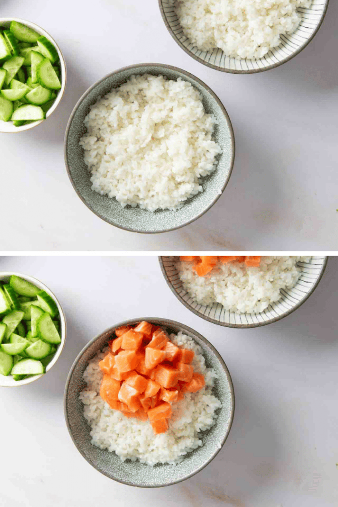 Teile den Reis auf zwei Servierschüssel auf. Teile Lachs, Gurke und Avocado gleichmäßig auf.