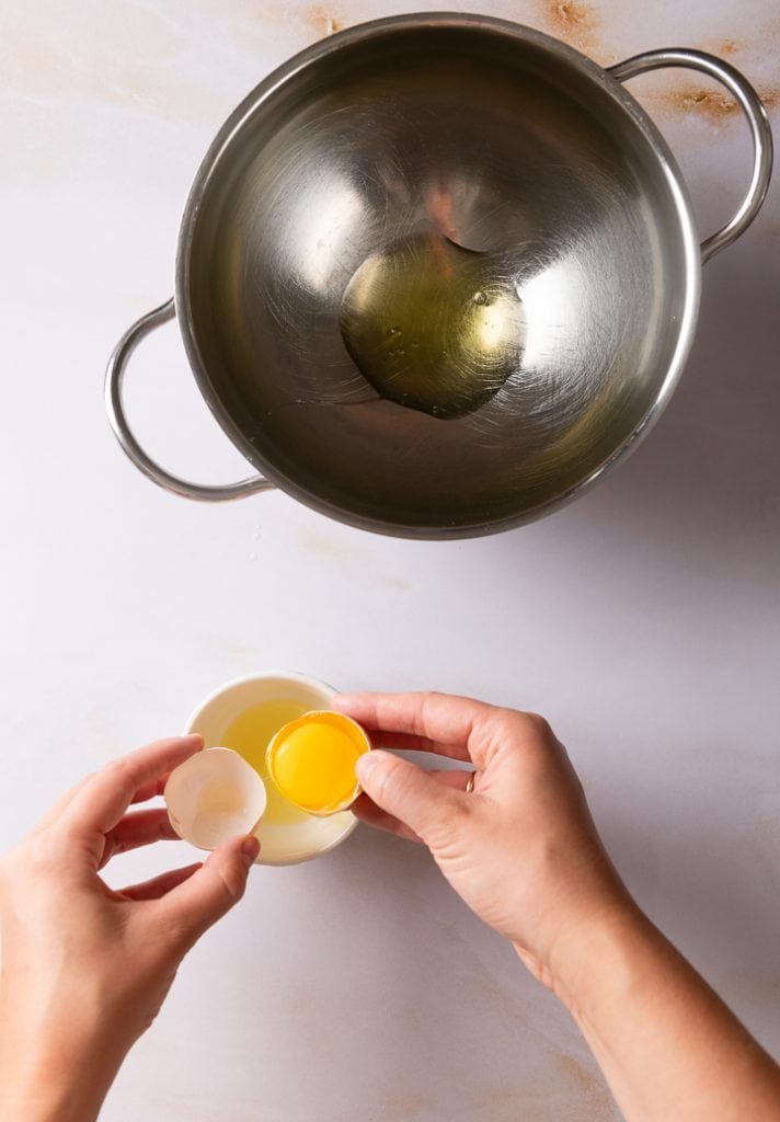 Trenne die Eier. Achte darauf, dass keinerlei Eigelb im Eiweiß ist. Ich trenne die Eier daher zur Sicherheit einzeln über einer Tasse.