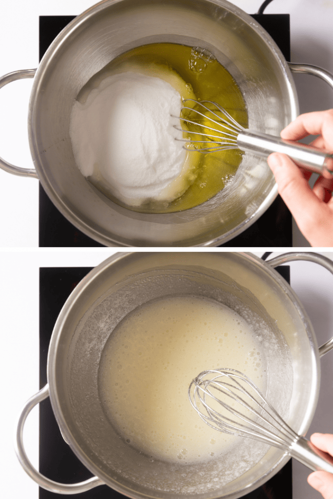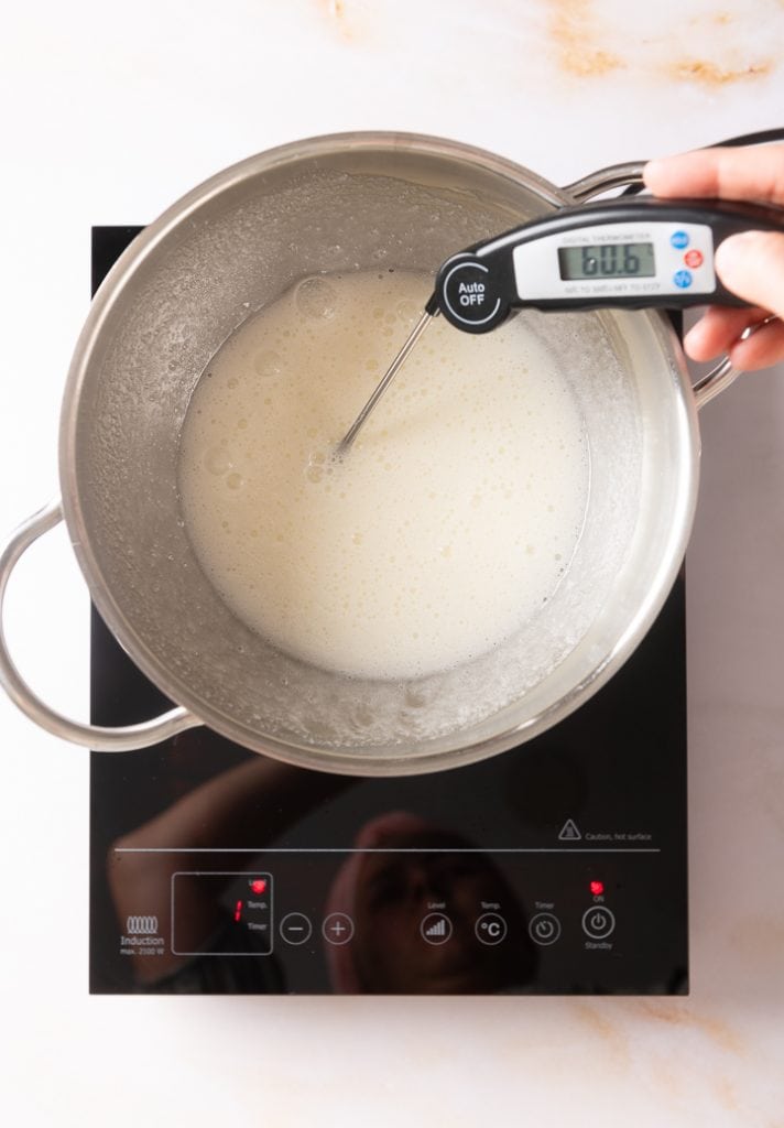 Die Masse sollte eine Temperatur von 60 Grad erreichen und diese auch 5 Minuten halten. Wenn sich alle Zuckerkristalle aufgelöst haben, nimm die Masse vom Wasserbad.