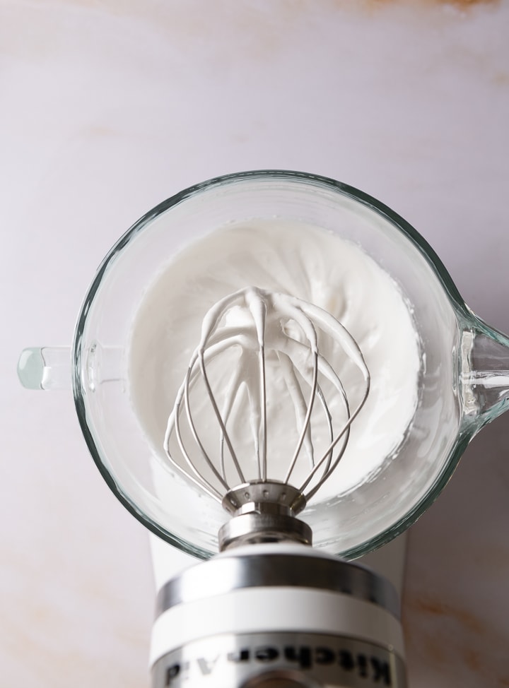 Gib die Eiweiß-Masse in eine große Rührschüssel und schlage sie mit der Küchenmaschine oder dem Handrührgerät kräftig auf, bis sie Raumtemperatur hat. Das kann bis zu 15 Minuten dauern.