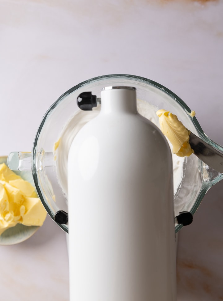 Gib nach und nach die zimmerwarme Butter dazu und rühre dabei auf höchster Stufe. Es entsteht eine luftige, helle Buttercreme.