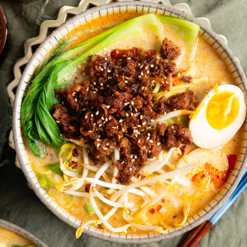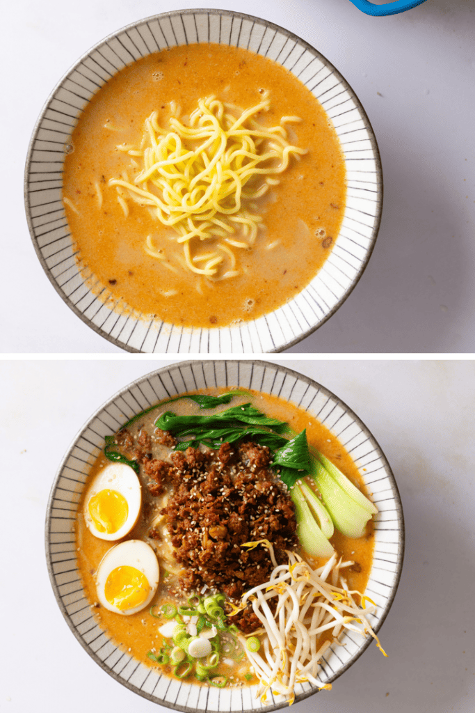 Japanisches Tantanmen Ramen Rezept mit cremiger Brühe mit Sesampaste und Chiliöl. Serviert mit würzigem veggie Hack ist die Tantan Ramen eine echte Geschmacksexplosion!