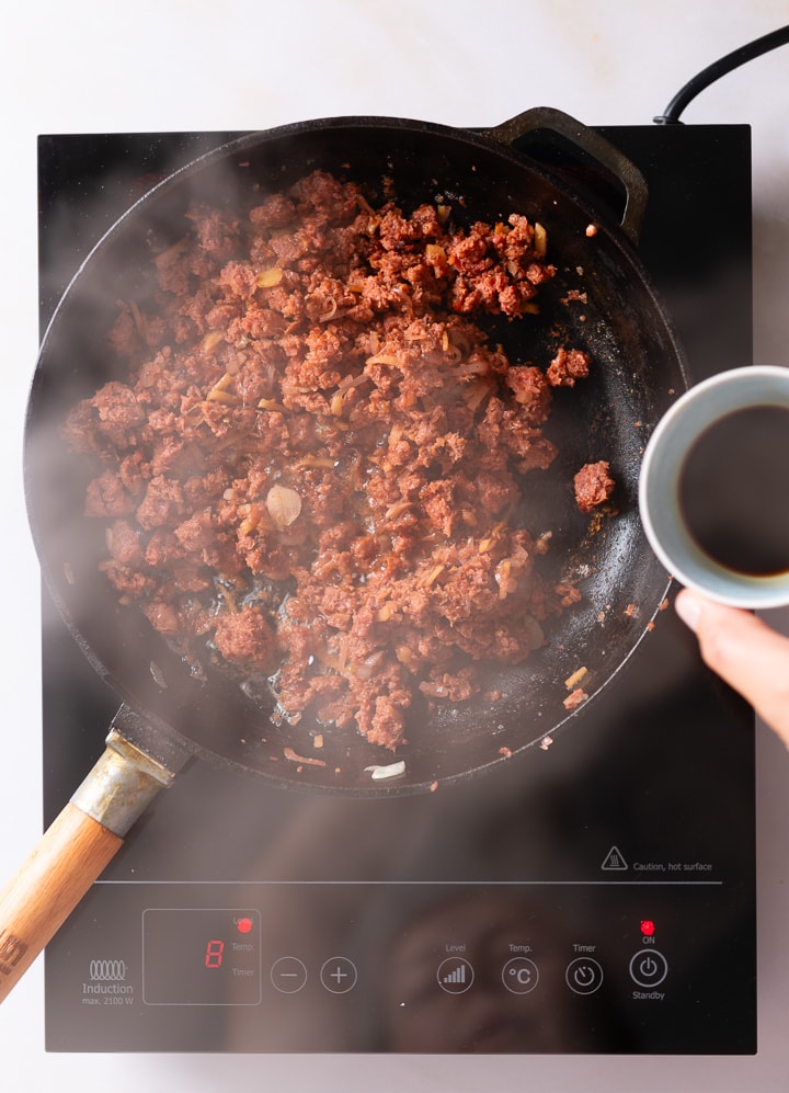 Füge dann Sesamöl und Sojasoße hinzu und brate das Hack unter gelegentlichem Wenden weiter bis es goldbraun und knusprig ist.