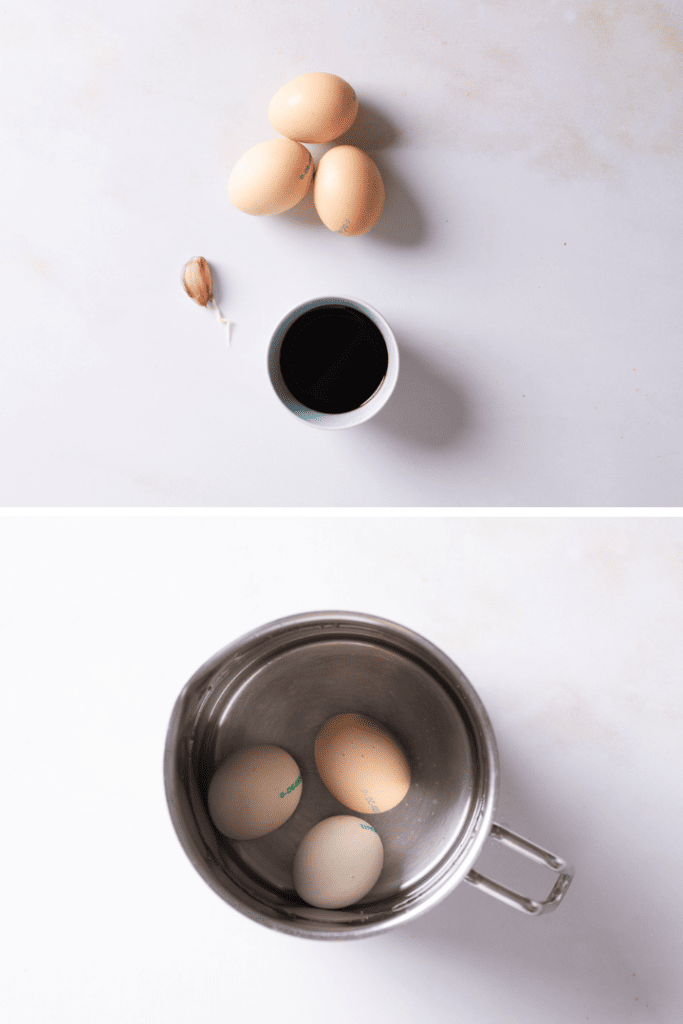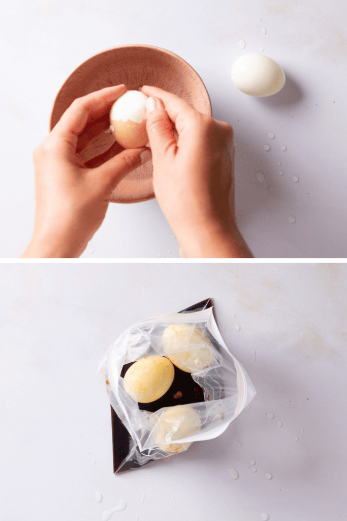 Schrecke die Eier ab, schäle sie und gib sie in eine Tüte oder ein hohes Gefäß. Füge Sojasoße, Wasser und die halbierte Knoblauchzehe hinzu. Lass die Eier für 30-60 Minuten marinieren. Maximal sollten die Eier für 3 Stunden marinieren, sonst werden sie zu salzig.