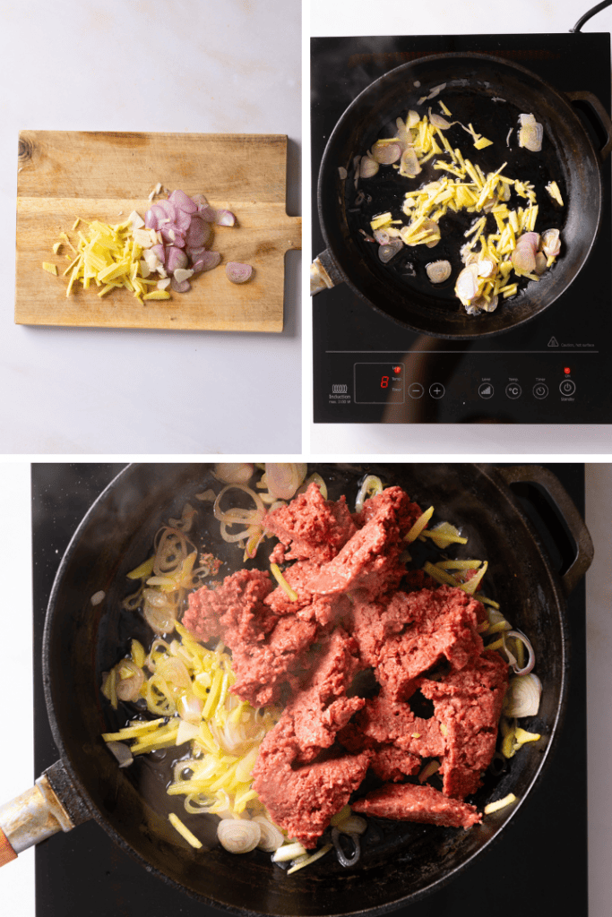 Hacke Knoblauch, Zwiebel und Ingwer sehr fein. Erhitze etwas Pflanzenöl in einer Pfanne und brate Zwiebeln, Knoblauch und Ingwer darin scharf an. Füge das Hackfleisch hinzu und brate es, bis beginnt knusprig zu werden.