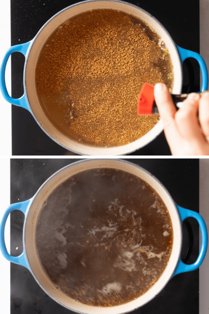 Bringe die Gemüsebrühe zum kochen. Füge das 5-Gewürze-Pulver und die Sojasoße hinzu. Lass die Gemüsebrühe etwa 10 Minuten bei geschlossenem Deckel köcheln.