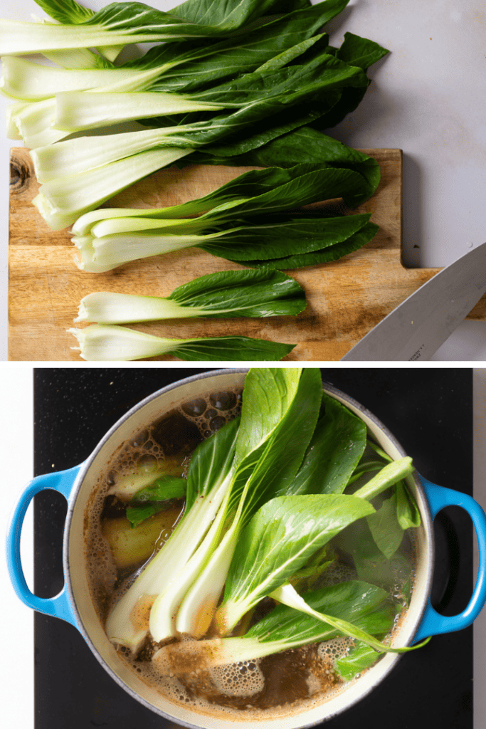 Schneide die Pak Choi Blätter zurecht. Kleine Blätter kannst du ganz lassen, größere Blätter solltest du längs halbieren. Gare die Pak Choi Blätter für ca. 2 Minuten in der heißen Gemüsebrühe.