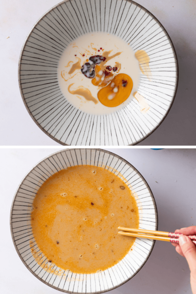 Gib Tahini, Sojamilch, Sesamöl und Chiliöl in zwei große Suppenschalen. Gieße etwas Gemüsebrühe auf und rühre kräftig um, sodass sich die Tahini auflöst. Gieße weitere Suppe auf, bis die Schale gut halb voll ist.