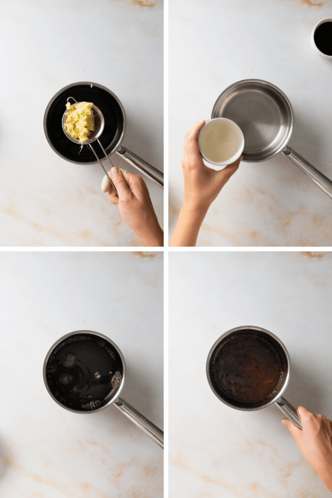Für die Teriyaki Sauce Ingwer fein reiben. Geriebene Ingwer mit Hilfe eines feinen Siebes auspressen. Saft in einen Topf geben. Sojasauce und Mirin dazu geben und bei mittlerer Hitze reduzieren lassen, bis die Sauce eine Sirupartige Konsistenz hat.