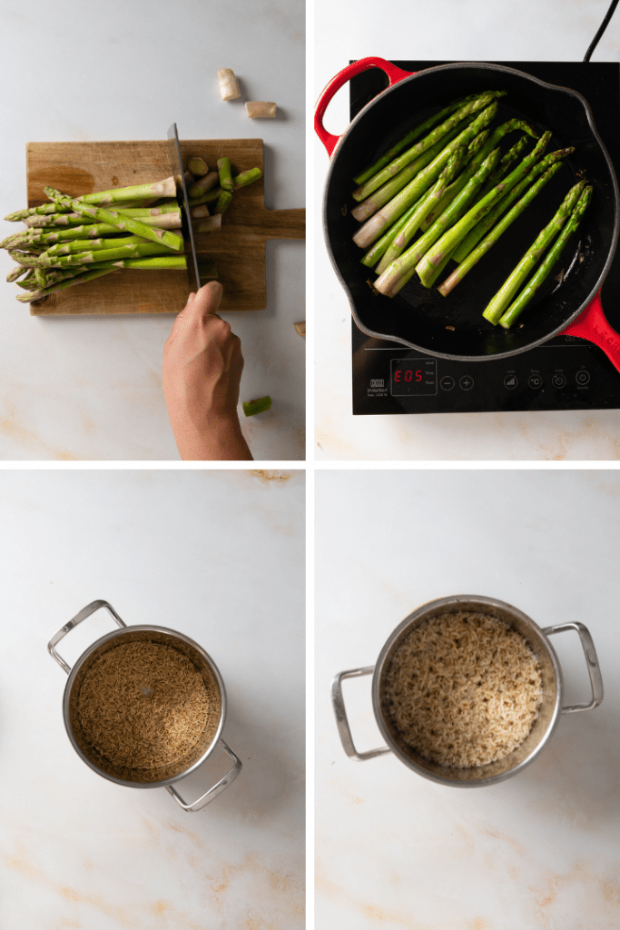 Während der Lachs gart, den Reis nach Packungsangabe zubereiten. Grünen Spargel oder ein anderes Gemüse (Bohnen, Brokkoli, Pak Choi o.ä.) in heißen Pfanne scharf anbraten.