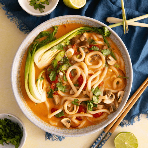 Alternative Zutaten: Anstelle der Udon Nudeln kannst du auch andere Nudeln wie zum Beispiel Soba- oder Ramennudeln verwenden. Beim Gemüse kannst du ebenfalls kreativ werden. Anstelle der Fischsauce eignet sich auch Sojasauce gut für die Thai Curry Udon Suppe.