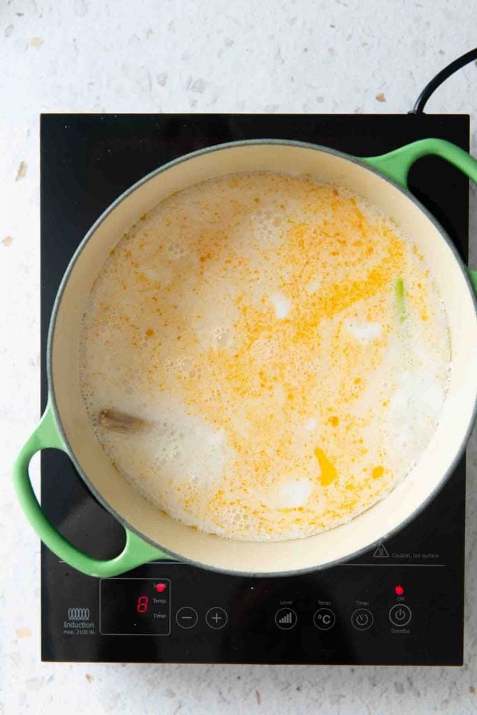Gib dann die rote Currypaste mit in den Topf und brate sie für ca. 1 Minute mit an. Lösche den Topf mit Kokosmilch und Gemüsebrühe ab. Gib die Kaffir Limettenblätter mit in den Topf und lass die Mischung aufkochen.