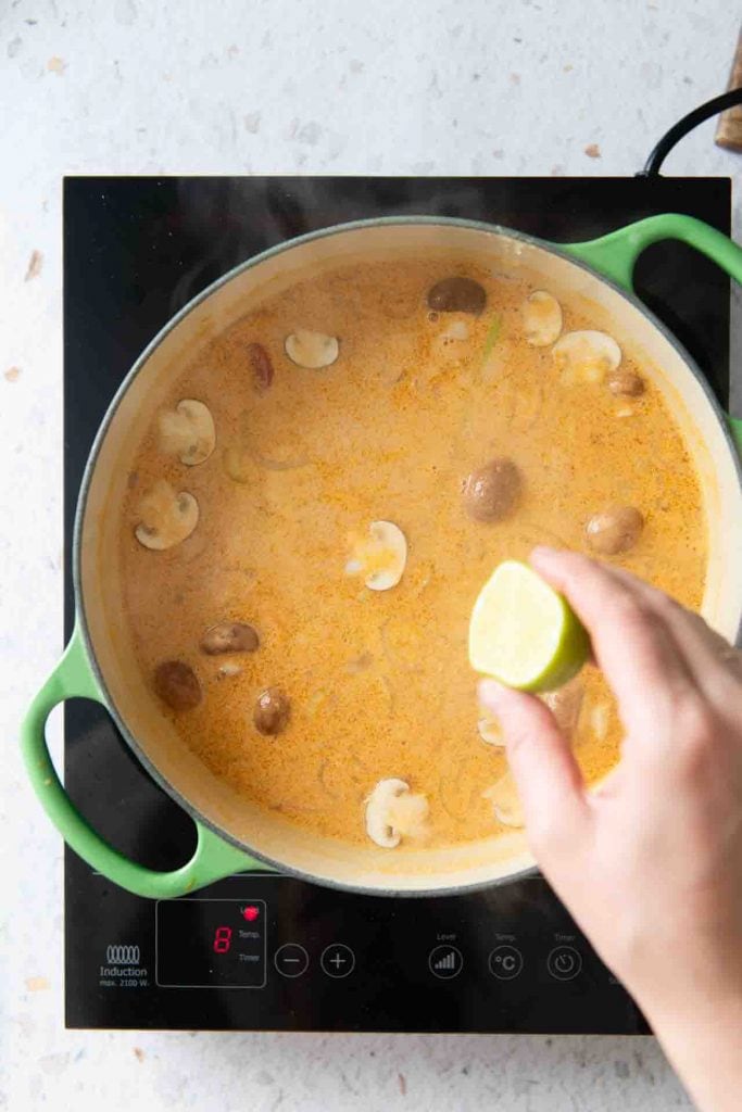 Würze mit Fischsauce, Limettensaft und Palmzucker sodass eine kräftige Suppe entsteht.