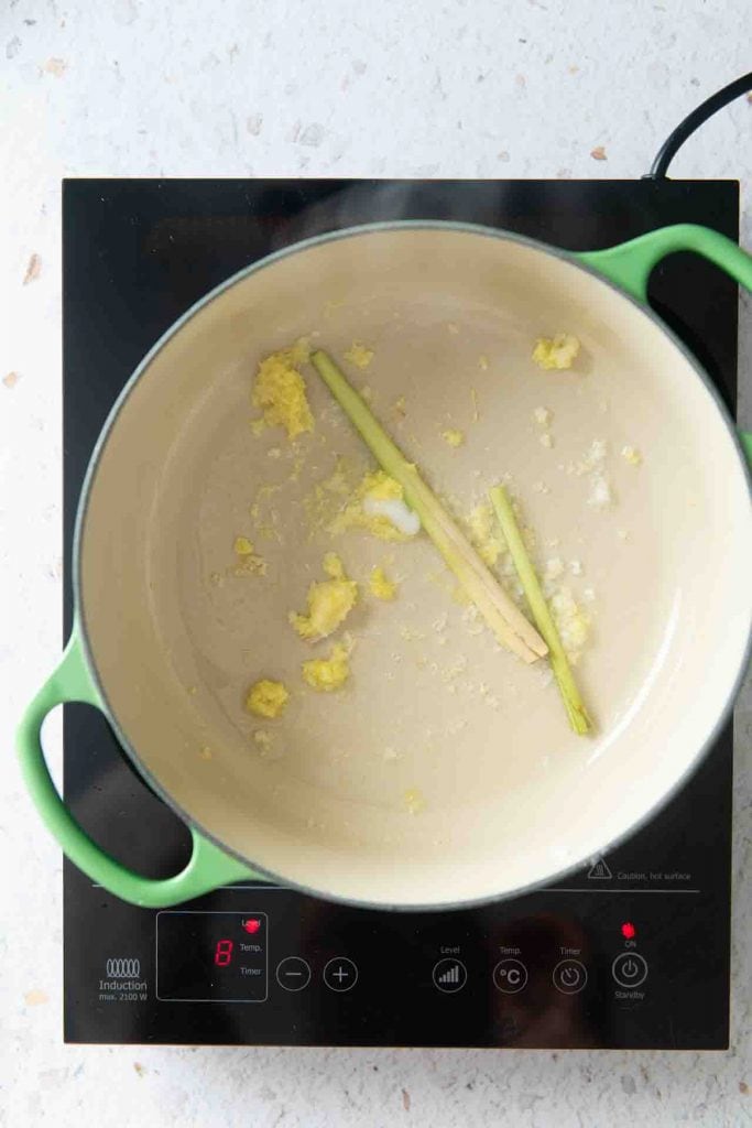 Klopfe einige male mit der stumpfen Seite eines Messers auf das Zitronengras, dadurch werden die ätherischen Öle aktiviert und halbiere es der Länge nach. Hacke Ingwer und Knoblauch sehr fein. Brate alles im Kokosöl an, bis der Knoblauch aromatisch wird.